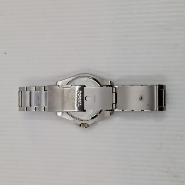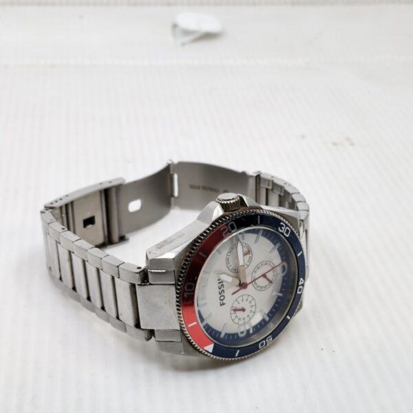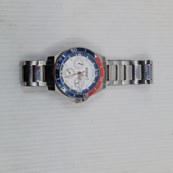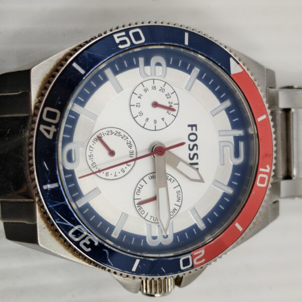 Stainless steel Fossil watch with red and blue bezel, white dial, and three subdials for day, date, and 24-hour time. Durable and stylish for active lifestyles.