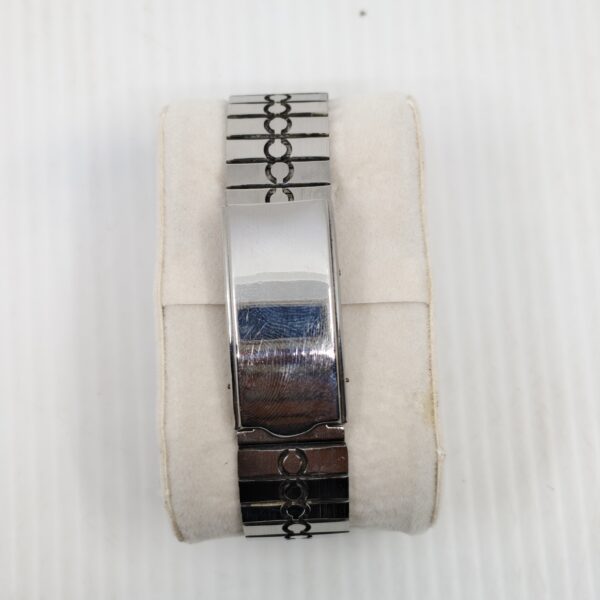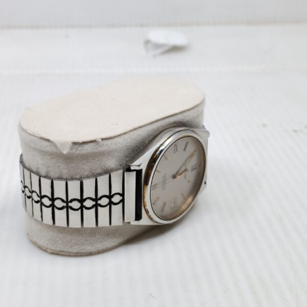 A graceful nod to classic Swiss design, the “Silver Regent” by Tissot blends timeless elegance with subtle eccentricity. Its silver sunburst dial features minimalist hour markers, Roman numerals at XII and VI, and a framed date window at 3 o’clock. The slender hands glide over a dial marked “Quartz,” affirming precision and reliability. The standout bracelet—adorned with a trio of black dots on each link—adds a touch of avant-garde charm to this otherwise refined silhouette. A collector’s piece that speaks softly yet stylishly.